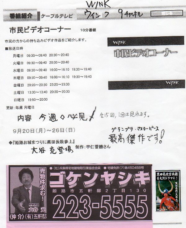 第1回官兵衛まつりがウインクの市民ビデオコ−ナ−ど放映されます。12月6日〜12日。