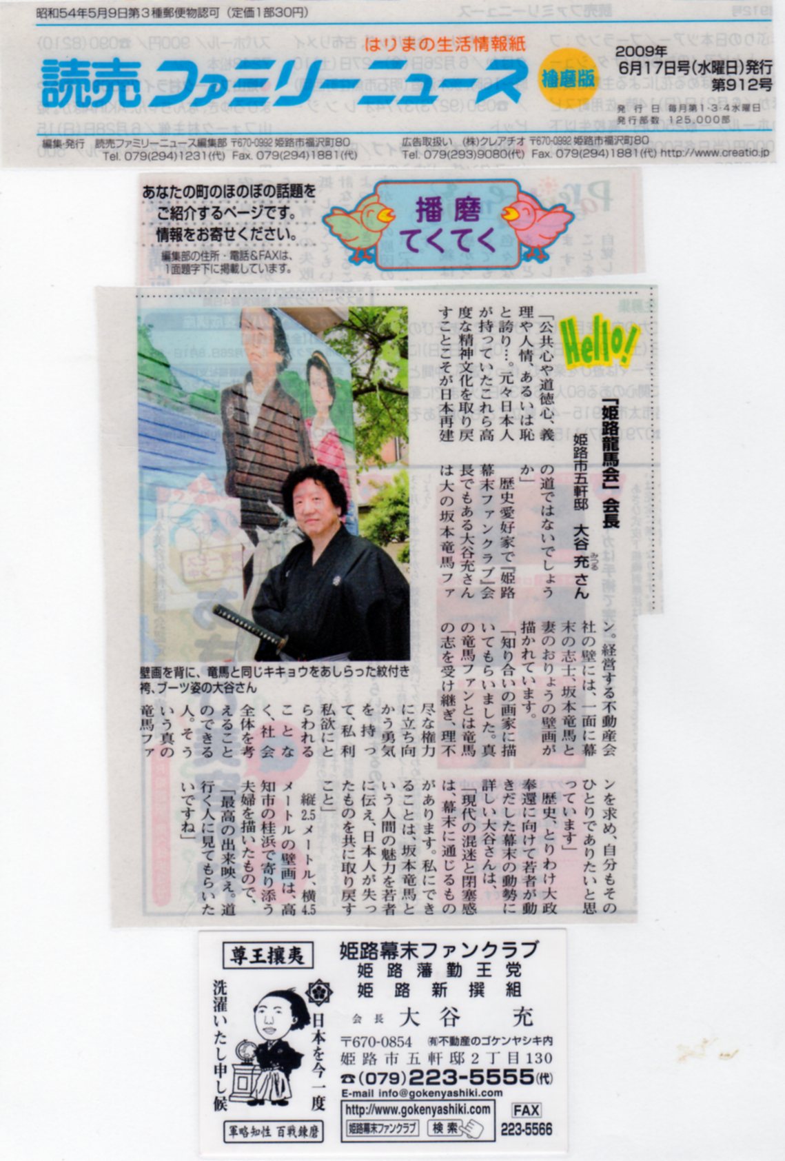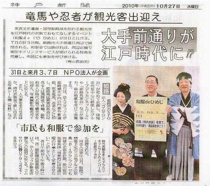 坂本龍馬、西脇に登場。イラスト展に大谷 充、姫路龍馬会会長が西脇のまちづくりに協力。 和服でひめじ,読売新聞に載る。先頭の甲冑姿が大谷 充