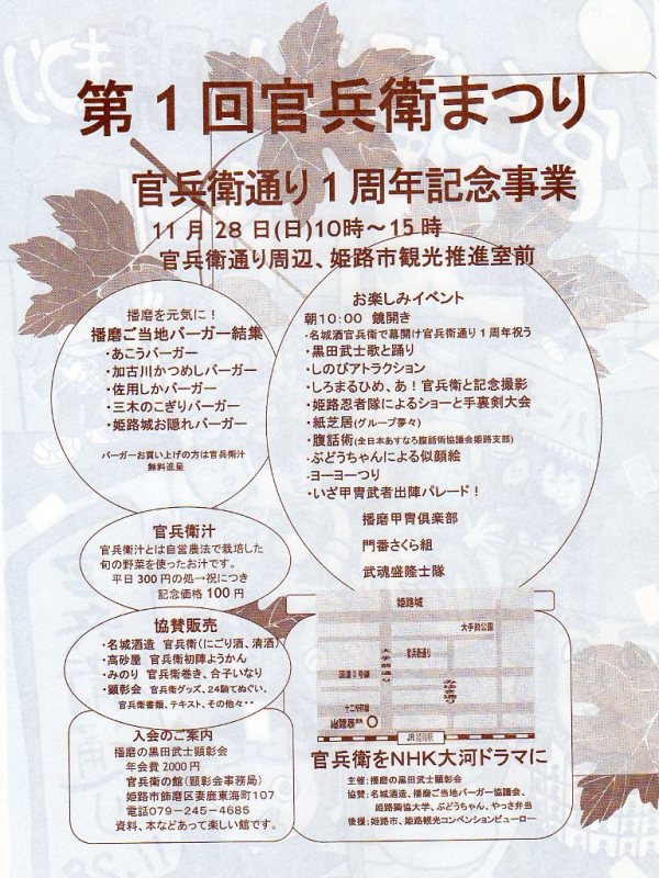 第1回姫路間黒田管兵衛祭り開かれる。播磨の黒田武士顕彰会初の、大手前通りみゆき通りパレ−ド[10時半頃スタ−ト予定。