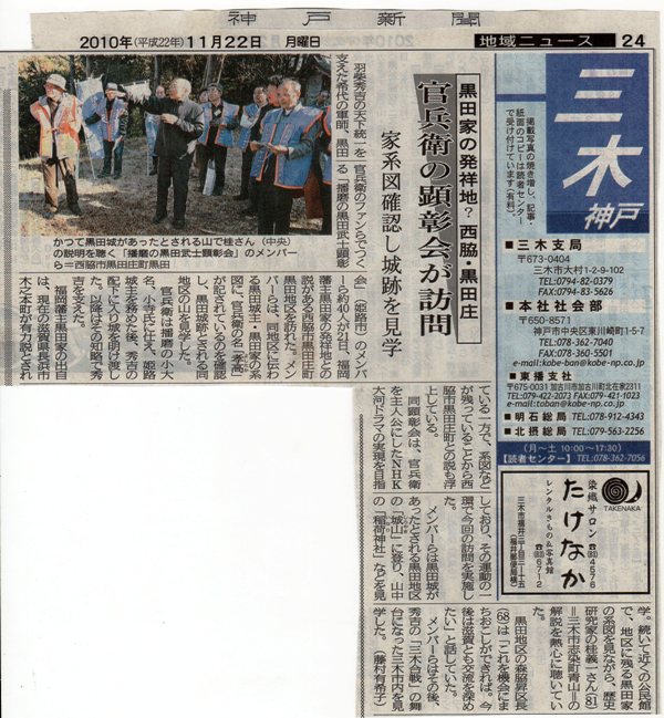 播磨の黒田武士顕彰会、黒田管兵衛家発祥の地、黒田庄を訪問,11月23日、姫路版にも掲載されました。藤村さんありがとうございます。