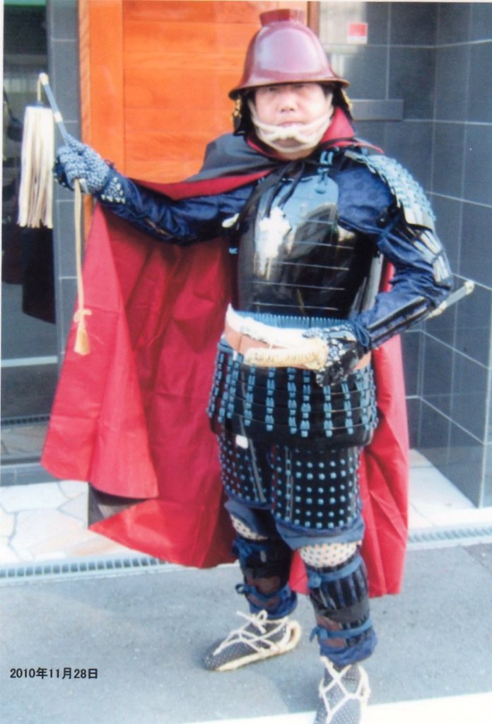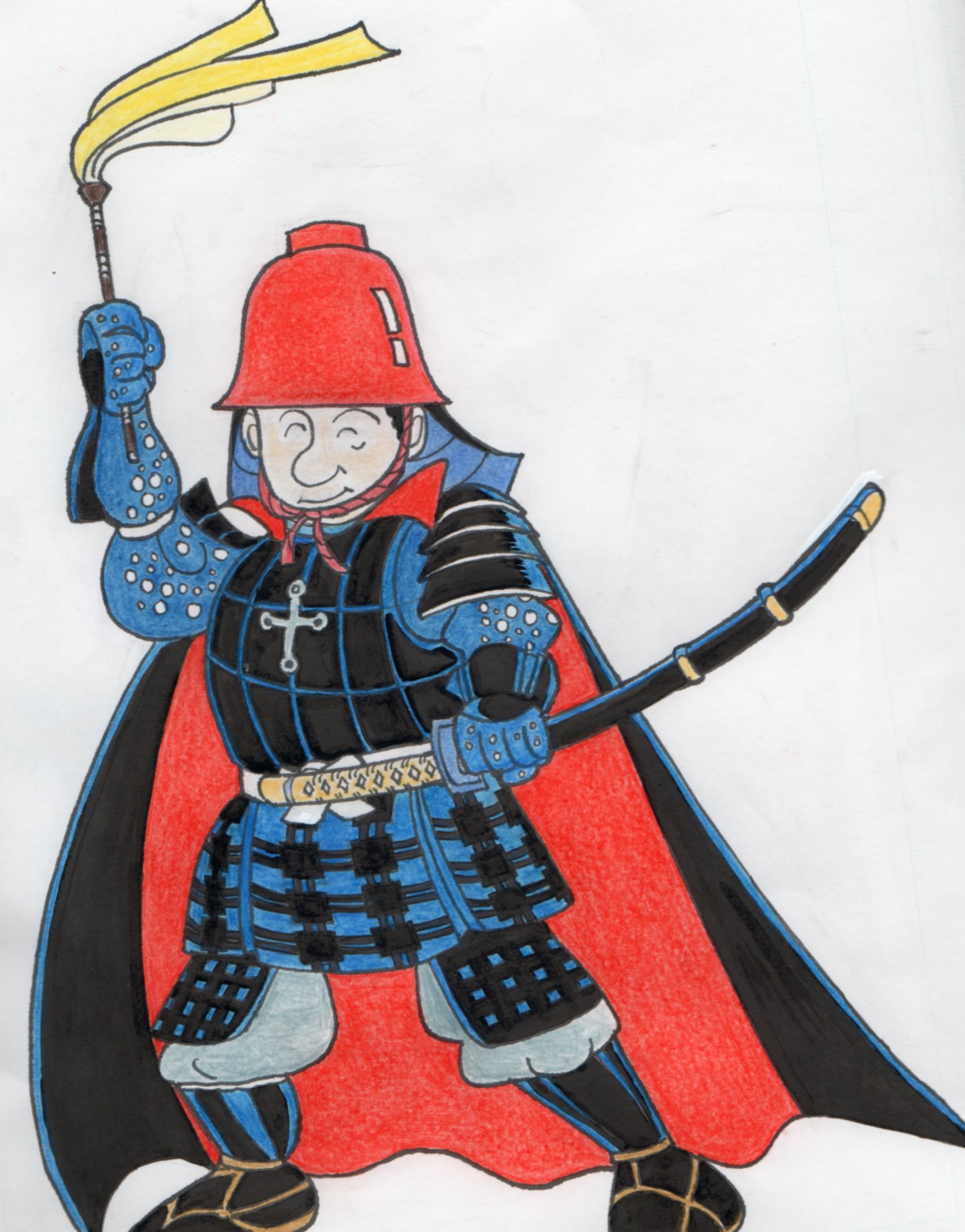 赤いマントに十字架(クロス)と合子なりカブトの黒田官兵衛BY大谷 充(播磨の黒田武士顕彰会理事)