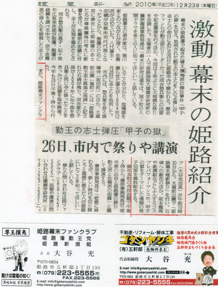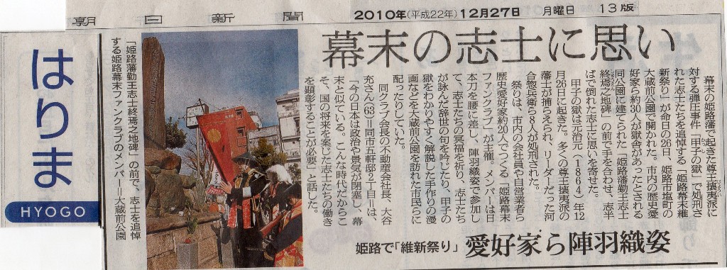 姫路藩勤王党、甲子獄を追悼。姫路幕末ファンクラブ。メジャ−全国新聞に取り上げられる。