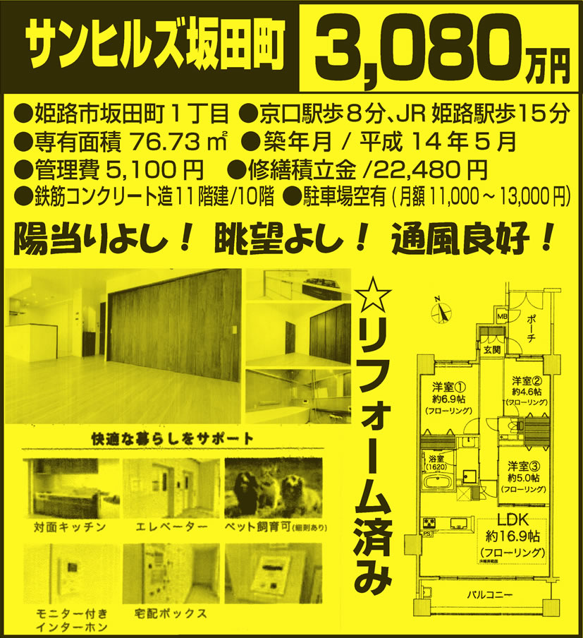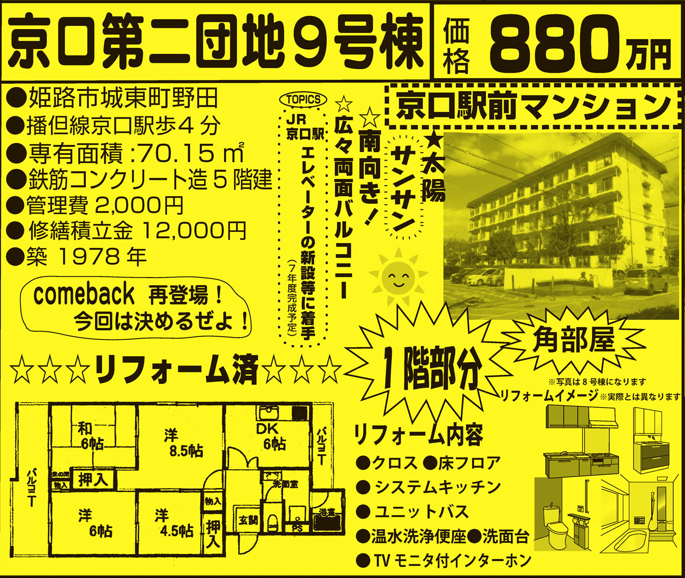 収益物件 中古物件 土地物件 賃貸 新築物件 など 中古マンション物件京口第二団地9号棟 880万円![]() サンヒルズ坂田町 3080万円![]() 山電飾磨駅前 1480万円![]() ご成約御礼 京口第2団地・京口第1団地![]() |